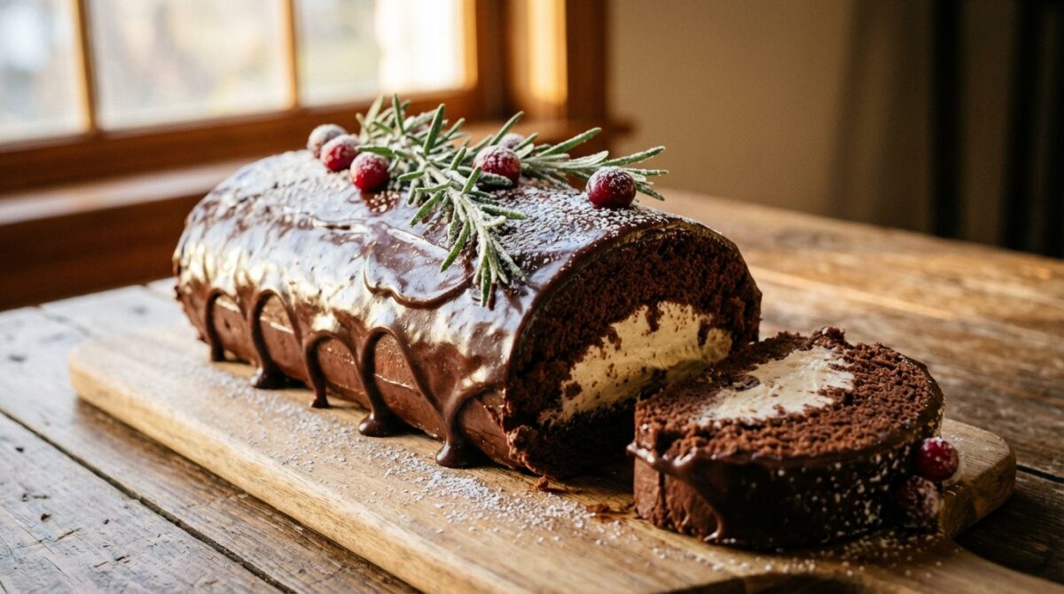 Cette bûche roulée au chocolat est composée d’une génoise cacao souple et d’une ganache lisse et homogène. L’ensemble offre une texture moelleuse qui se roule sans casser, avec une garniture fondante et intense. Le dessert se déguste froid pour une découpe nette, ou légèrement tempéré pour un cœur plus crémeux. Il se prépare facilement à l’avance, ce qui en fait une option idéale pour un repas de fête ou un dessert à partager. La réussite repose sur trois points simples : un montage d’œufs suffisamment aéré, une cuisson courte pour garder la souplesse de la génoise, et une ganache bien émulsionnée pour obtenir une tenue régulière. Cette base accepte aussi des variantes, comme une fine couche fruitée, un praliné ou un chocolat plus ou moins corsé selon le résultat recherché.