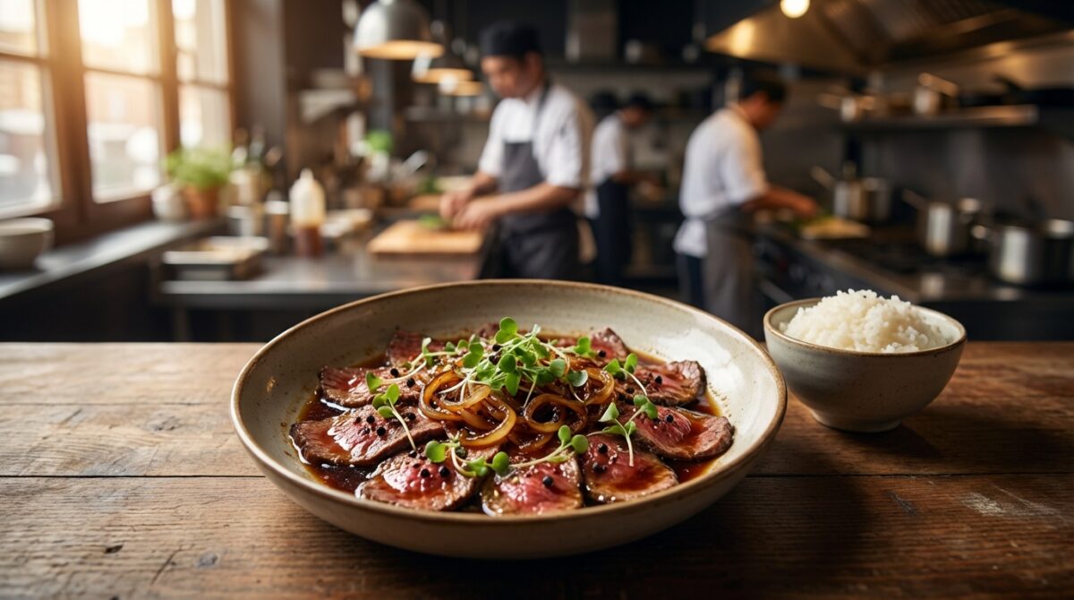 Ces ingrédients suffisent pour un plat complet, surtout si l’on sert une portion généreuse de riz blanc à côté. Pour une assiette encore plus raffinée, on peut ajouter en finition quelques herbes fraîches ciselées, tout en laissant la vedette à la viande et aux oignons fondants, véritables piliers de ce délice de carpaccio de bœuf.