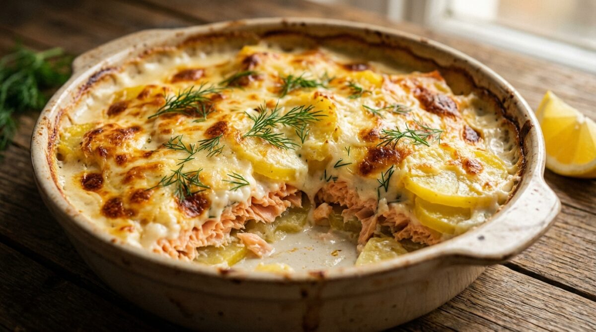Oui. Montez le gratin avec le saumon, les pommes de terre et la béchamel, sans ajouter le fromage. Filmez et réservez au réfrigérateur jusqu’à 24 heures. Ajoutez le fromage au moment d’enfourner et cuisez 25 à 30 minutes à 190–200°C, jusqu’à ce que la surface soit dorée et que la sauce frémisse.