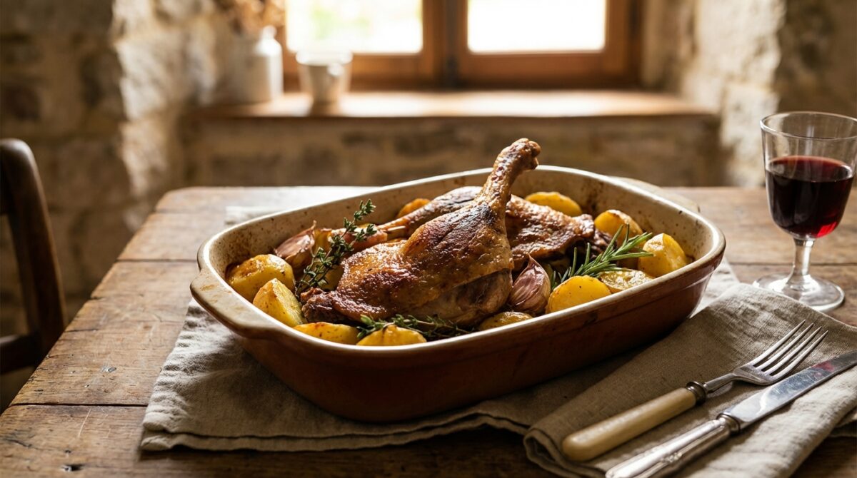 Le confit de canard est un plat traditionnel du Sud-Ouest, pensé pour nourrir simplement, mais avec une grande générosité. Quand il rôtit au four, la graisse crépite doucement, l’odeur de viande de canard se mêle aux herbes et à l’ail, et la cuisine se transforme en petite table d’auberge. On est loin des effets de manche : rien de spectaculaire, et pourtant tout est là, dans le parfum, la chaleur et la lenteur de la cuisson.