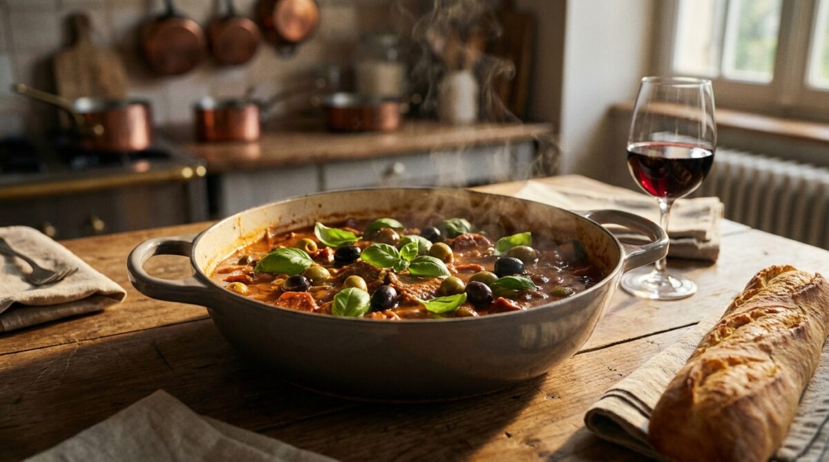 Ce sauté de veau au chorizo associe la douceur de la viande et le piquant maîtrisé de la charcuterie épicée. La cuisson lente permet d’obtenir une viande tendre et juteuse, bien enrobée d’une sauce tomate onctueuse. Les olives et le basilic apportent une touche méditerranéenne agréable. Ce plat s’inscrit dans la tradition de la cuisine française mijotée, simple et familiale. Il se prépare avec des ingrédients courants, faciles à trouver en toute saison.