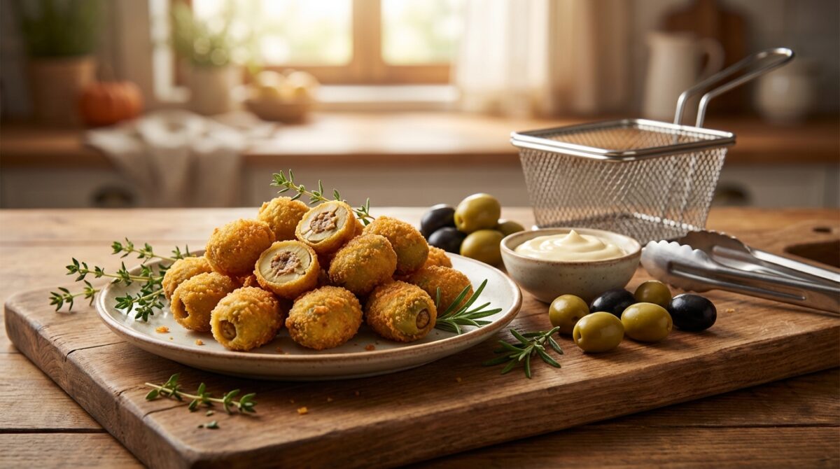 La préparation se déroule en trois enrobages successifs : farine, œuf, chapelure. Cette technique garantit un extérieur bien croustillant tout en préservant le cœur juteux des olives. Avec un peu d’organisation, même un débutant peut obtenir un résultat digne d’un bar à tapas.