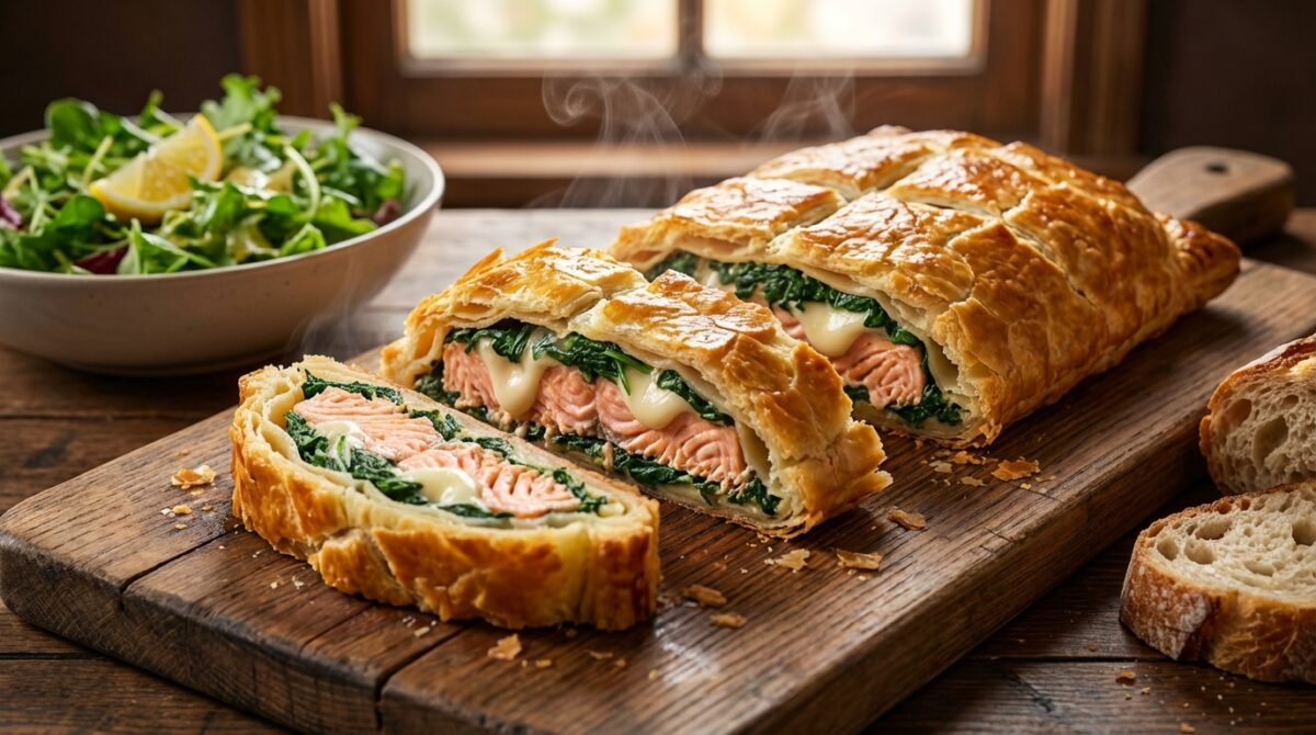 Ce saumon en croûte aux épinards et mozzarella est un plat principal complet, conçu pour obtenir une pâte feuilletée croustillante et une garniture bien liée à la découpe. Le saumon reste moelleux grâce à une cuisson maîtrisée, tandis que les épinards bien égouttés et la mozzarella fondante assurent une texture homogène sans excès d’humidité. Cette recette se prépare rapidement avec des ingrédients simples et une organisation efficace. Elle convient aussi bien à un dîner en semaine qu’à un repas plus soigné, car elle peut être préparée à l’avance et enfournée au dernier moment. Servi chaud après un court temps de repos, le feuilleté se tranche proprement et conserve un contraste net entre le croustillant extérieur et le cœur fondant.