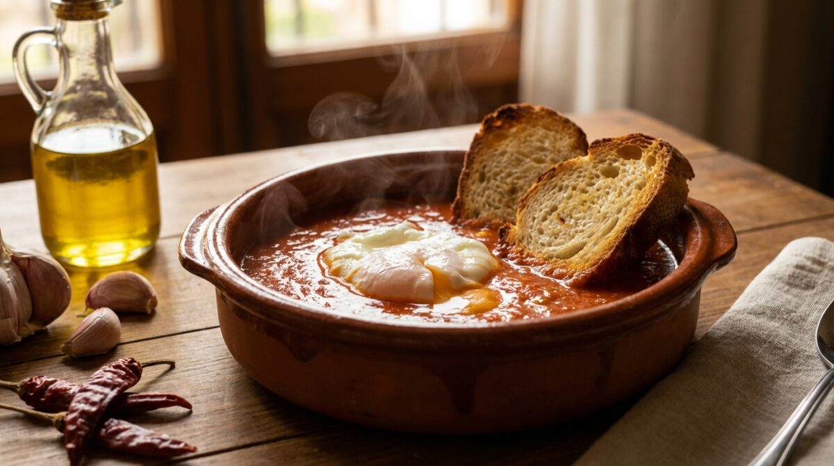 Servez immédiatement, très chaud, en déposant l’œuf au centre de chaque bol. Pour une finition simple, ajoutez un filet d’huile d’olive crue et un tour de poivre. Si vous voulez une version plus complète, faites revenir quelques dés de chorizo ou de jambon 1 minute dans l’huile avant d’ajouter l’ail, puis poursuivez la recette normalement. Pour une version végétarienne, utilisez un bouillon de légumes corsé et un paprika fumé. Si vous préférez du contraste, faites griller une partie du pain au four et ajoutez-le au moment du service pour garder du croquant. La base se conserve 24 heures au réfrigérateur sans les œufs : réchauffez doucement et pochez les œufs juste avant de servir.